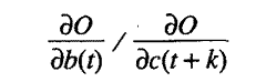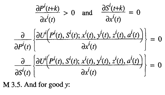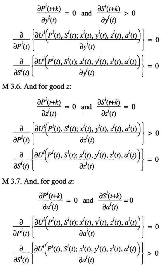 M 3.9. The single bias in the economy is specified by charging individual purchasers of x, y, and z the net marginal social cost of providing them the activity, but charging those who purchase a some amount in excess of the net marginal social cost. To reflect this, we can let 0 = O(x(0), y(0), z(0), a(0); ... x(t), y(t), z(t), a(t); ... ) define the traditional production transformation locus of all efficient productions for the economy as a whole. Then the ratios of the marginal social costs of producing one more unit of b at time t in terms of the number of units of c that must be foregone at time (t+k) would be