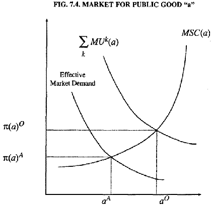 The inefficiency can be seen from the perspective of the aggregate market as follows. The actual demand expressed in the marketplace for a public good, a, lies everywhere below the marginal-social benefit curve, yielding the wellknown result that the actual amount of the public good, aA that would be supplied under a market allocative mechanism would be less than the socially optimal amount, a0. From the suppliers' perspective, the actual market price, pA, they will receive is less than the price that would elicit an optimal supply, no, so they supply less than the socially optimal amount of the public good as depicted in figure 7.4.