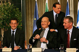 My final disdain for the UN emerged yesterday, when the world leaders came to visit Prime Minister Ehud Olmert in Jerusalem. I understand the need for diplomacy, but this was practically a love fest (as shown to the left). This winter of love was summed up by Sarkozy, practically quoting Olmert’s lofty statement (which- from Olmert- sounds like the promise of a long continuation of the occupation):