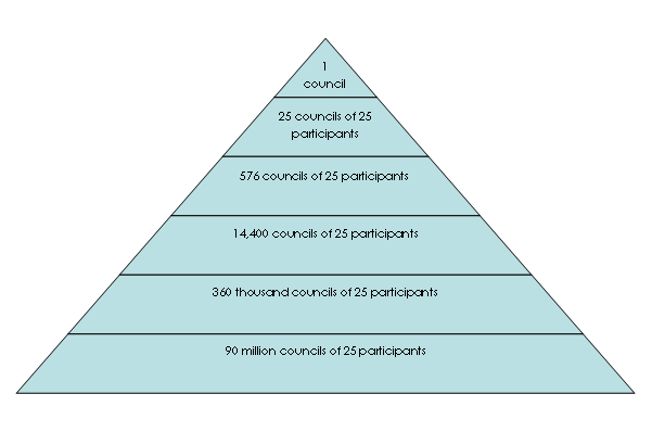 Of course 25 people wouldn’t even take care of one side of my street, but my questions don’t stop there. What kind of facilitation board(s) would be needed to service over 90 million councils – and would they have to be federated? How would we map these councils? To be in the top council would require those 25 people to be actively involved in the five lower councils. How would they juggle that and their regular jobs?