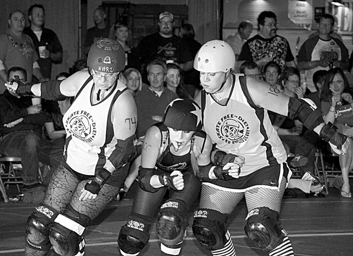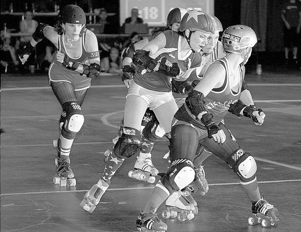 Behind me in the bleachers during the championship bout sit some cowbell-ringing men—a so-called "Derby-widow" and his pals. These guys are making noise for their buddy's wife and for the team that has become the center of their social life. In front of me sits a group of about eight young lesbians and transmen, mostly students or recent graduates of local colleges. They have a connection with one of the volunteer officials—"characters" with great names like Whistler's Mutha, Jeff da Ref, and Messy Jessy.