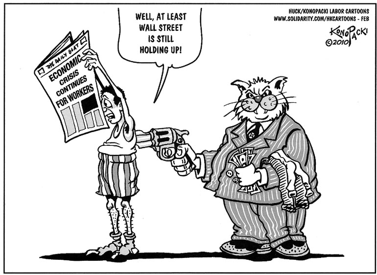This coming year may be remembered as the year in which politics began to catch up to the continuing economic crisis. In January, in the Senate election in Massachusetts, working- and middle-class voters emphatically registered their impatience with the $2.3 trillion in bailouts to bankers, insurance companies, big corporations, and wealthy investors—who quickly resumed giving themselves record bonuses once again. They expressed their anger with bankers getting free money from the government at zero percent interest rates—just as quickly used to speculate in foreign currencies, stocks, and properties abroad—while they cannot get their mortgage loans modified, cannot obtain student loans at anything but exorbitant market rates, or are increasingly denied bank loans to keep their small businesses from collapsing. They recorded their disgust with credit card companies successfully thwarting even timid Congressional efforts to place a cap of 34 percent on card charges and fees. They expressed their distrust with the promise of a health care reform bill that morphed daily into a health insurance industry subsidy bill—giving insurance companies millions of new customers at taxpayer expense while workers with health insurance largely pay for it all. They noted their discontent with revelations that giant companies like AIG and Goldman Sachs got reimbursed 100 percent by the U.S. Treasury for their speculative bets and loans while they, the working and middle class, continued to lose their own homes by the millions each year, or were forced to watch as their home values collapsed below mortgages owed. Not least, they recorded their rage with the nearly $500 billion of the $787 billion stimulus package spent by Congress in tax cuts and subsidies that have yet to trickle down to produce jobs.