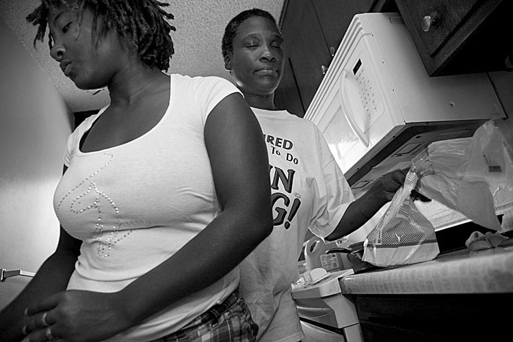 Nnekia Stevenson was living with her three-year-old son and his father in Berkeley. Despite holding down two jobs while her son’s father worked in construction, she couldn’t make ends meet and moved in with her mom in Fruitvale. Neither had much money and hardly any furniture. Nnekia works with children at a local agency, ISOP, and was able to get a few days work a month at the New United Motors Manufacturing plant in Fremont. But NUMMI closed in April, so Nnekia plans to start school in the fall to get a degree in childhood development. Nnekia’s mother gets SSI for her disability, which disqualifies them for food stamps. Terri was homeless off and on for 30 years, but finally moved into a shelter, Chrysalis, where she participated in rehab and got help finding a home.