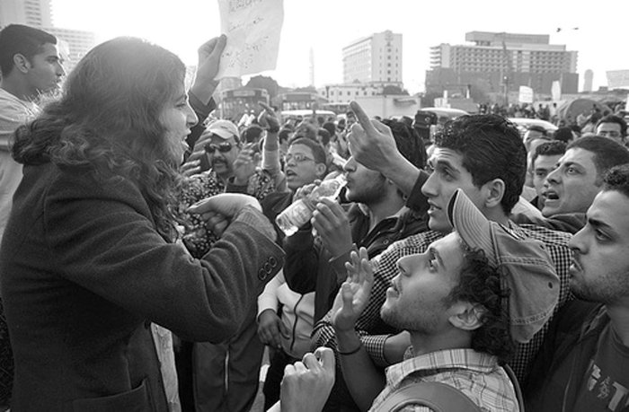 One evening, Johnson writes, "I saw a young western woman running across the street, east of Tahrir, holding her head, a group of men stalking her. And I watched as three women stood in Tahrir simply holding their posters, completely surrounded by another mob of men. One man, Yousef, dressed in a well-cut suit and wearing sun-glasses, was yelling at the three women, in chorus with other protesters, 'Not now.' Yousef explained that Egyptians could not focus on the grievances of one group of people. 'It is about all Egypt now,' he said. 'We have to stand together. No one group should act alone. We have other goals first. Later they can talk about what they want.' His sentiments were repeated again and again by other reactionary men. "