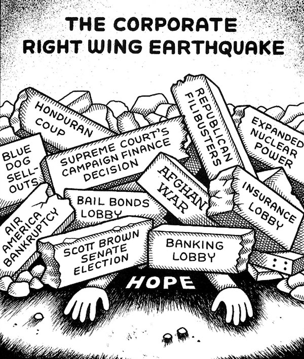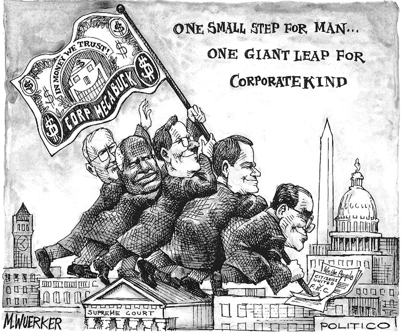 The Obama performance confirms that this pattern of Democratic inability to serve popular interests, followed by Democratic political loss, and then further moves to the right, is now built in to the system. This results in large measure from the steady increase in inequality and business/finance/elite power, the concomitant decline of organized labor, and the absence of any other focal points of power for ordinary citizens. This is reflected in a political system where money rules and candidates, to be effective, must be able to raise lots of it. There is a de facto primary in which serious candidates must solicit big money and, in the process, are vetted by that money. Candidates outside the two-party system, even with the prestige of a Ralph Nader, do not enter the money primary and cannot compete in the U.S. political system. The packing of the Supreme Court with rightwingers, with Democratic help, has assisted in this plutocratization process, recently culminating in Citizens United v. FEC, which should make corporate domination of politics even more complete.