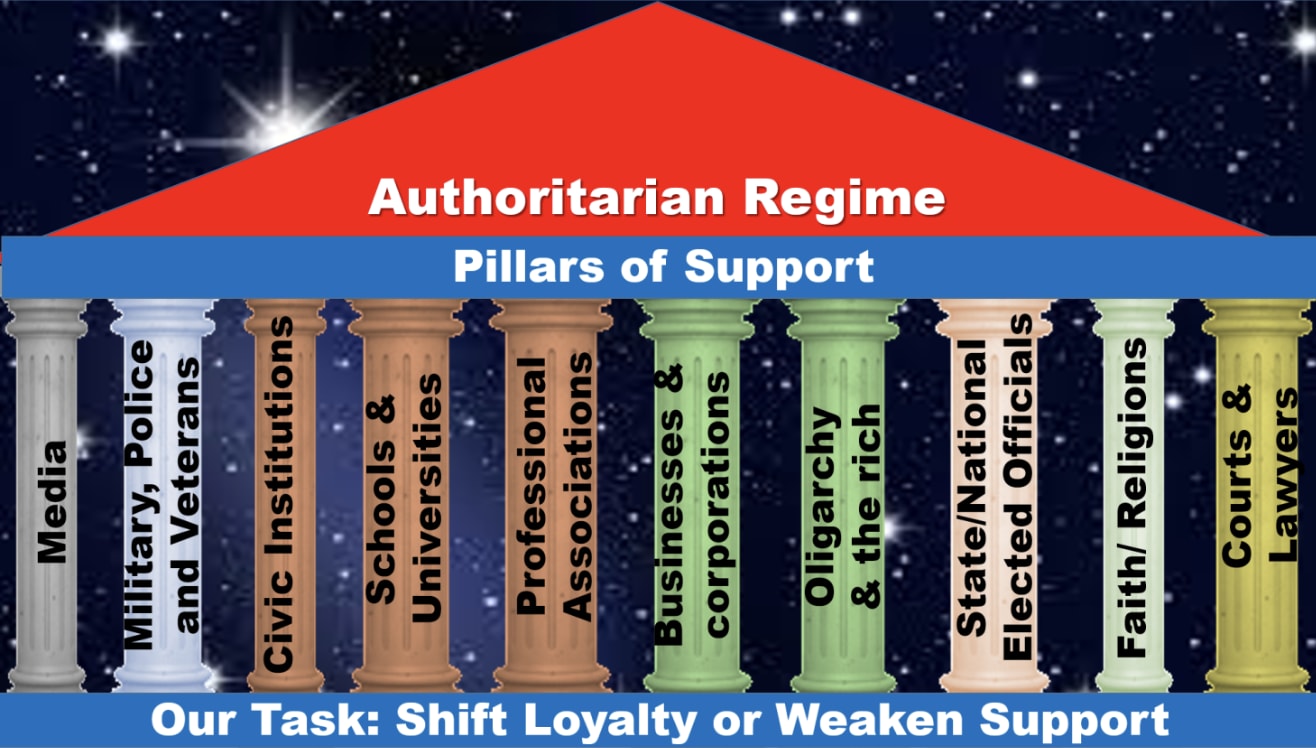 Authoritarian rulers can only survive through the cooperation of key “pillars of support” in society like businesses, schools, the civil service, churches, and the media. That’s why our best bet to defeat the Trump regime is by pressuring such institutions to distance themselves from authoritarianism and to side, explicitly or de facto, with the mass movement for democracy. As scholars of effective anti-authoritarian tactics note, “if these organizations and institutions begin to withdraw their support from your opponent (and some may even start actively supporting your movement), your opponent will no longer be able to maintain control.”