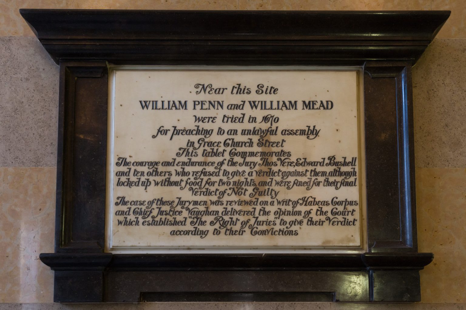 Near this site, William Penn and William Meade were tried in 1670 for preaching to an unlawful assembly in Grace Church Street. This tablet commemorates the courage and endurance of the jury, Thomas Veer, Edward Bushel, and 10 others who refused to give a verdict against them, although locked up without food for two nights and were fined for their final verdict of not guilty. The case of these jurymen was reviewed on a writ of habeas corpus, and Chief Justice Vaughan delivered the opinion of the court, which established the right of juries to give their verdict according to their convictions.