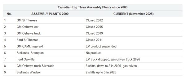 For Canada, jobs have declined by close to 30% – worse than in the US as a whole, but not as high as in the Mid-West, though the latest data predates the impact of the tariffs. In 2000, the US-based Big Three – GM, Ford, and Chrysler (now Stellantis) – had nine assembly plants in Canada. In spite of the massive subsidies over the years, no new plants have been added by the Big Three; four facilities have since closed; three are in limbo, waiting for products; and one has lost a shift and there is uncertainty about its future. Only two Big Three assembly plants are currently assembling motor vehicles (one expecting the addition of a third shift in 2026).