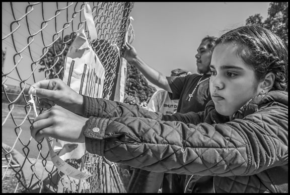 At the end of an hour of songs, prayers and speeches, the participants wrote messages on white ribbons to those still detained, and tied them onto the chain-link fence.