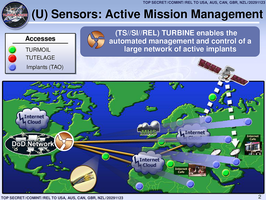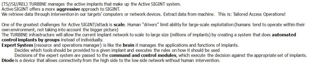 The ramifications are starkly illustrated in one undated top-secret NSA document, which describes how the agency planned for TURBINE to “increase the current capability to deploy and manage hundreds of Computer Network Exploitation (CNE) and Computer Network Attack (CNA) implants to potentially millions of implants.” (CNE mines intelligence from computers and networks; CNA seeks to disrupt, damage or destroy them.)