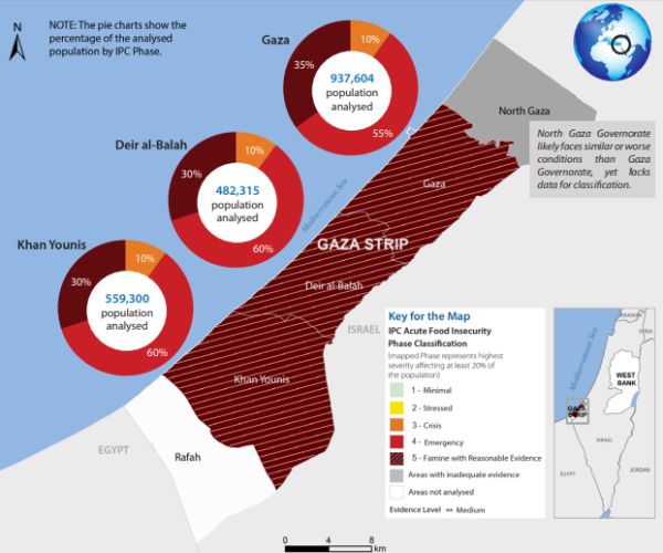 By the end of September, more than 640 000 people across Gaza will face Catastrophic levels of food insecurity; classified as IPC Phase 5. An additional 1.14 million people in the territory will be in Emergency (IPC Phase 4) and a further 396 000 people in Crisis (IPC Phase 3) conditions.