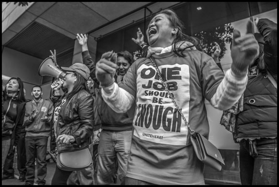 Room cleaners won a $1.75 per hour raise retroactive to last August, and significant raises in the next three years, while fully employer-paid health care is guaranteed for the life of the contract. Housekeepers won workload reductions. The new contract strengthens workers’ rights around the introduction of technology in the workplace, the “Green Choice” program, sexual harassment of room cleaners by guests, employee safety, and immigration. The strike stopped Marriott from contracting out room service and food service in a number of hotels. In San Francisco, workers won unprecedented job protections – if they’re laid off their names go into a pool where they’ll receive preference for rehiring at other hotels.