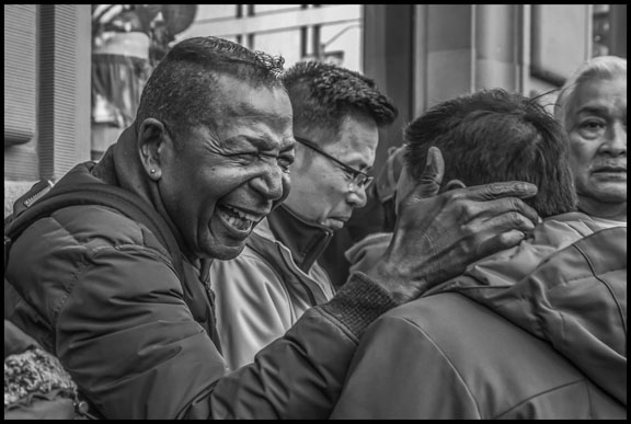 Striker Richard Mason, one of the longest-term workers at the Saint Francis, shows his happiness on hearing that a settlement has been reached in the Marriott strike.