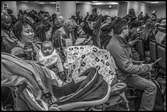 Hotel housekeepers bring their children and infants to the strike ratification meeting.