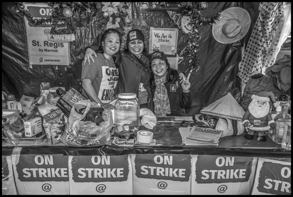 Camucha King and other St. Regis strikers put up Christmas decorations on their picket line when Marriott Corporation stonewalled negotiations at Thanksgiving, as a way to tell the company they were prepared to continue the strike through the holidays.