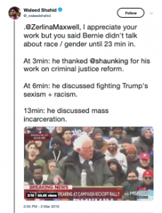 That is a big difference. It’s also a total lie. Sanders mentioned race, gender and discrimination multiple times at the beginning of his speech and long before the 23-minute mark, as anyone who actually watched it – which presumably includes all the MSNBC personalities on that panel who sat silently as this lie was broadcast – obviously knew was a lie. For good measure, Maxwell repeated the same lie she told on MSNBC in a tweet that she posted: