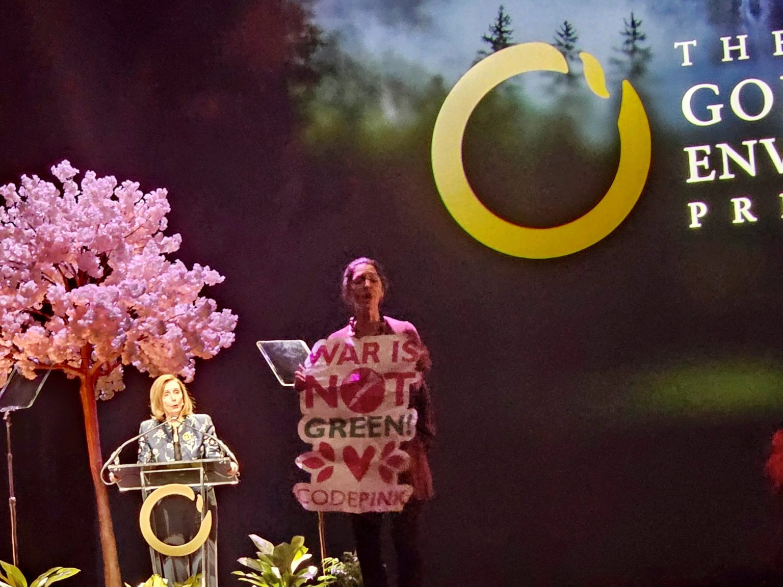 “It’s a huge hypocrisy to have Nancy Pelosi speak at an environmental ceremony,” said DiNucci. “Pelosi voted for almost a trillion dollar Pentagon budget. That money should go for climate justice. The people awarded today represent communities that have been devastated by our war machine.”