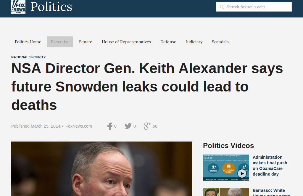Over the last 40 years, the U.S. government has relied on extreme fear-mongering to demonize transparency. In sum, every time an unwanted whistleblower steps forward, we are treated to the same messaging:Ā Youāre all going to die because of these leakers and the journalists who publish their disclosures!Ā Lest you think thatās hyperbole, considerĀ this headline from last weekĀ based on an interview with outgoing NSA chief Keith Alexander: