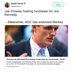“While Ed Markey is fighting for the Green New Deal in the Senate, Joe Kennedy is getting campaign support from Crowley hosting a high-dollar fundraiser on October 15th,” Ocasio-Cortez’s team wrote in an appeal for donations that would be split between her and Markey.