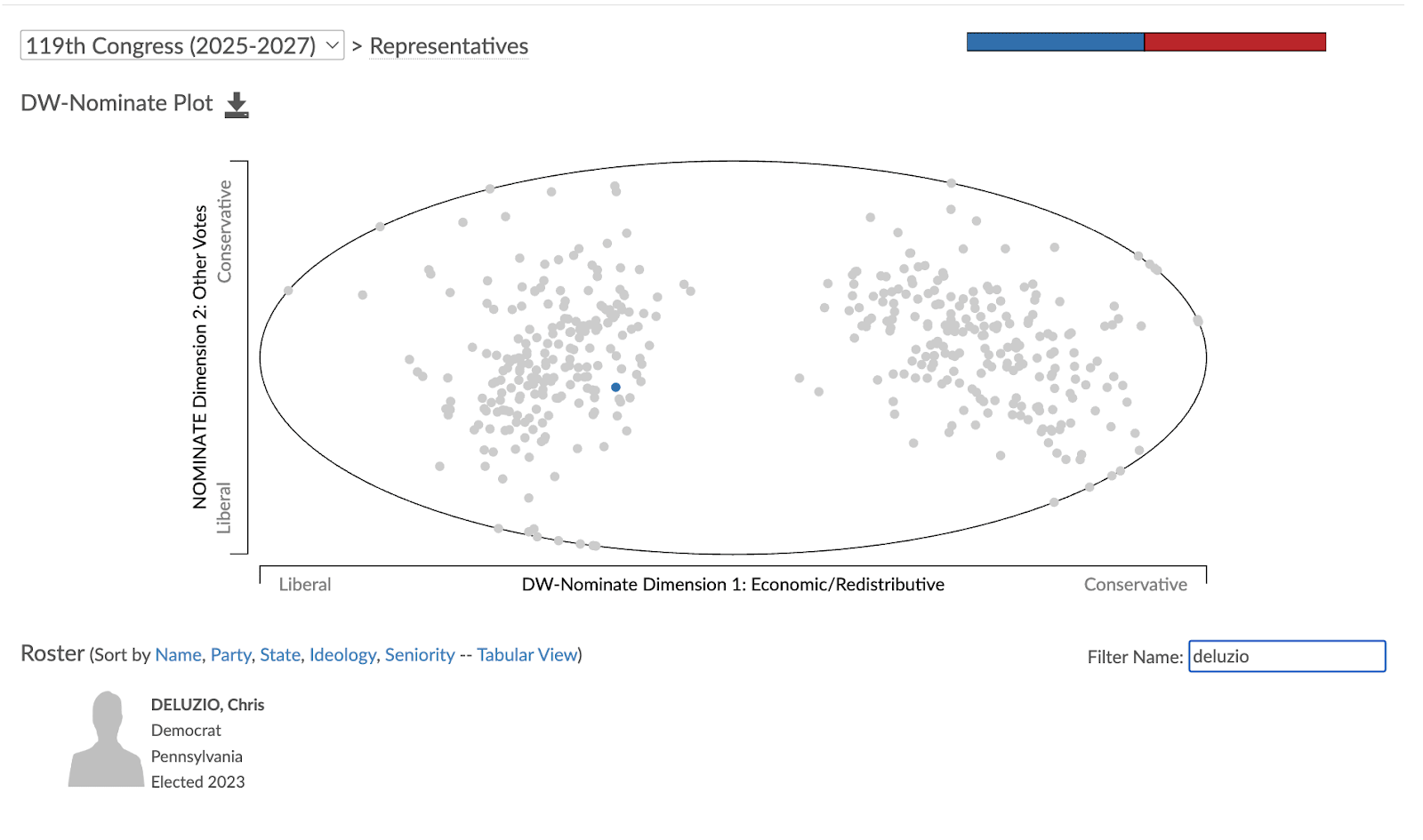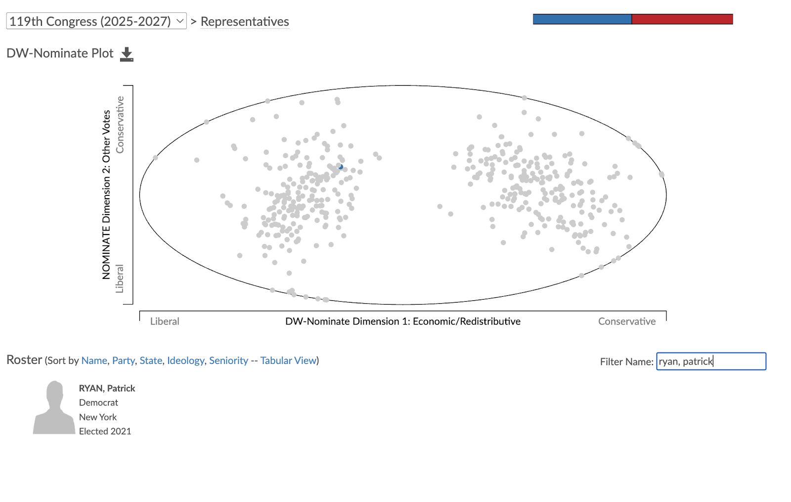 Within the Democratic Party, the progressive faction faces a similar strategic dilemma. According to the Cook Political Report (2025), of the 94 House members in the Congressional Progressive Caucus (CPC), 89 represent deep blue districts rated D+5 or higher. Only a handful represent more competitive seats below that threshold, and those representatives all vote, to no surprise, in a less progressive manner than members of The Squad. This stark partisan and electoral math translates directly into legislative behavior. For example, the more red your district, the less progressive or populist votes you’re going to take. And the more secure your district is, the more likely you will buck the party establishment on some votes (the farther down you are in the graph the more likely you are to challenge your own party’s behavior, one key metric of realignment):