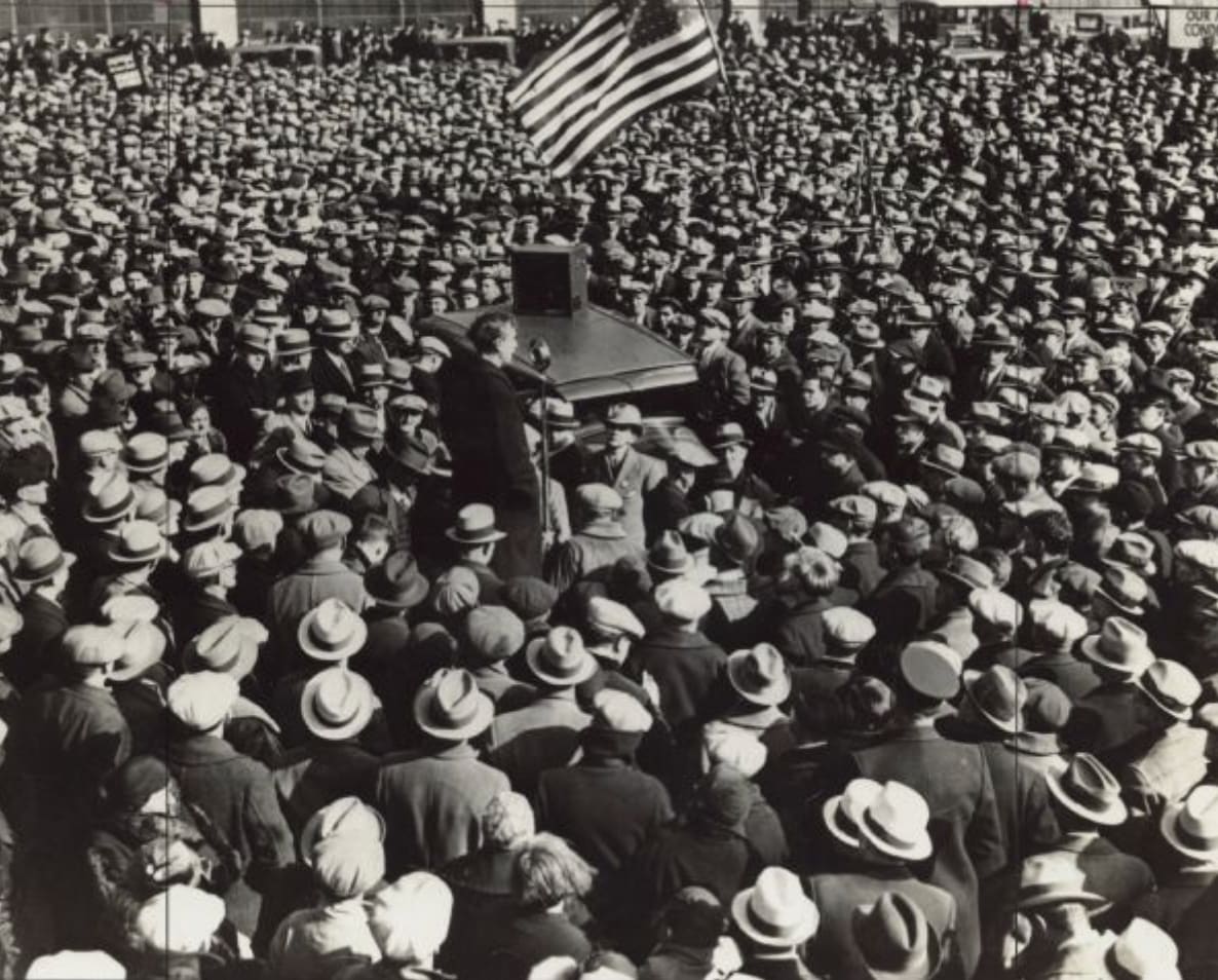 Mayor Daniel Hoan speaking in front of the Seaman auto plant during a strike. Wisconsin Historical Society.