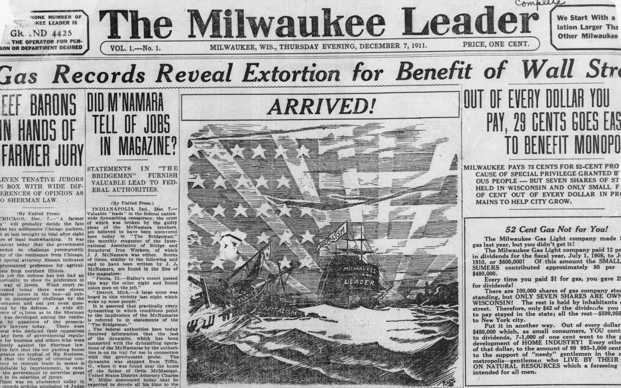 Issue One of The Milwaukee Leader, with a cartoon of the newspaper’s ship sinking capitalism (1911).
