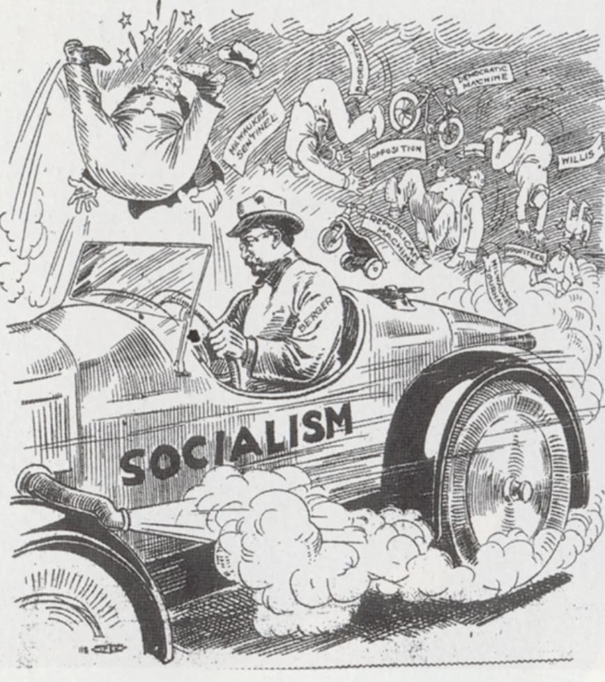 Cartoon from The Milwaukee Leader (1911) showing Berger’s socialism car knocking over the profiteers and political opposition.