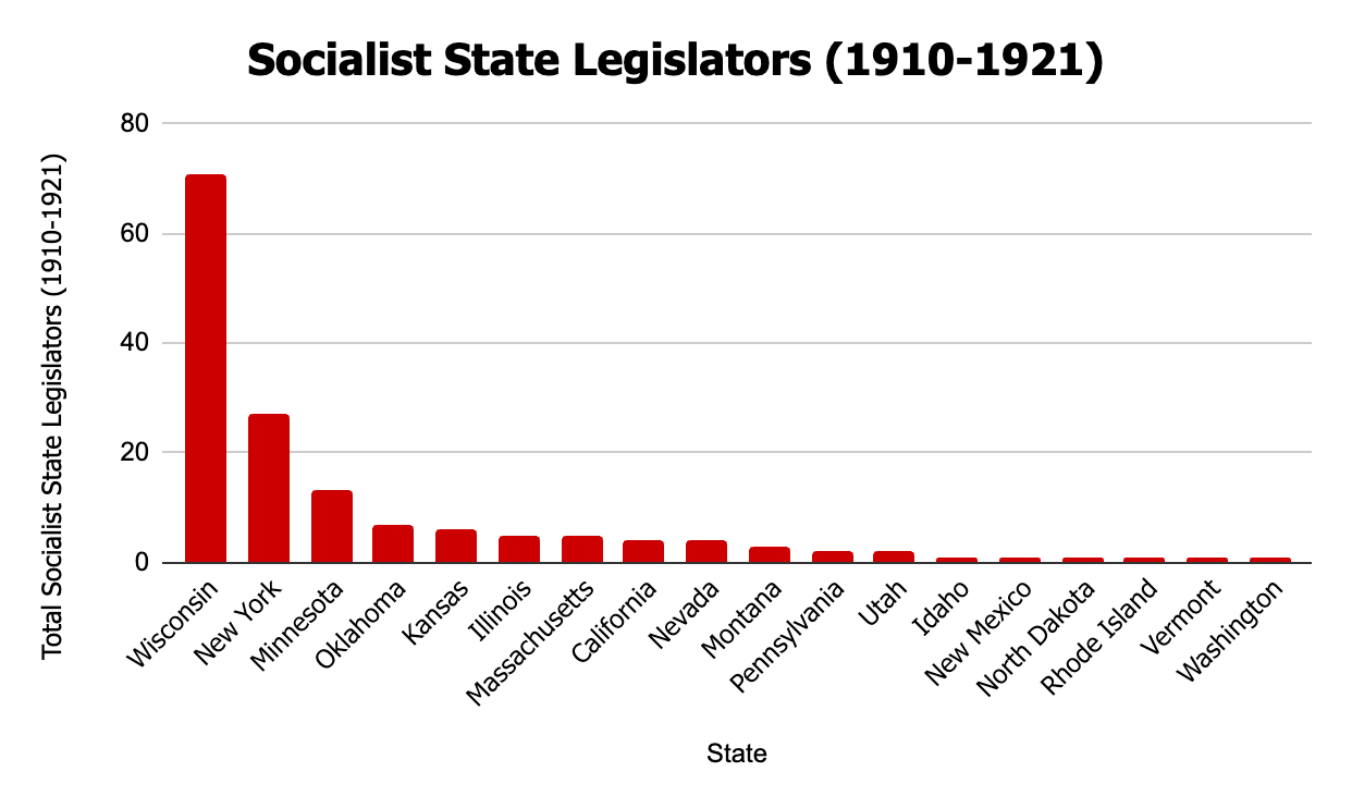 Nowhere in the US were socialists stronger than in Milwaukee. And Wisconsin was the state with the most elected socialist officials as well as the highest number of socialist legislators (see Figure 1). It was also the only state in America where socialists consistently led the entire union movement — indeed, it was primarily their roots in organized labor that made their electoral and policy success possible, including the passage of 295 socialist-authored bills statewide between 1919 and 1931.