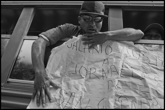 A striking farm worker on a bus from the San Quintin Valley holds a sign demanding A Fair Wage for Farm Workers in San Quintin.