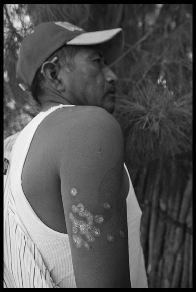 Faustino Hernandez, a leader of the FIOB in the San Quintin Valley, shows the wounds in his arm, received when he was shot by police during the farm worker strike.
