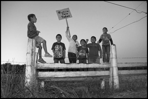 Outside the labor camp in Burlington, the children of strikers set up their own picket line on a fence at the gate. Their sign reads “Justicia Para Todos” – Justice for Everyone.