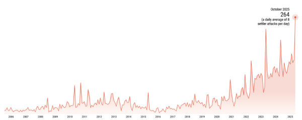 October 2025 recorded the highest monthly number of Israeli settler attacks since the UN Humanitarian office (OCHA) began documenting such incidents in 2006. That’s more than 260 attacks resulting in casualties, property damage or both – an average of eight incidents per day.
