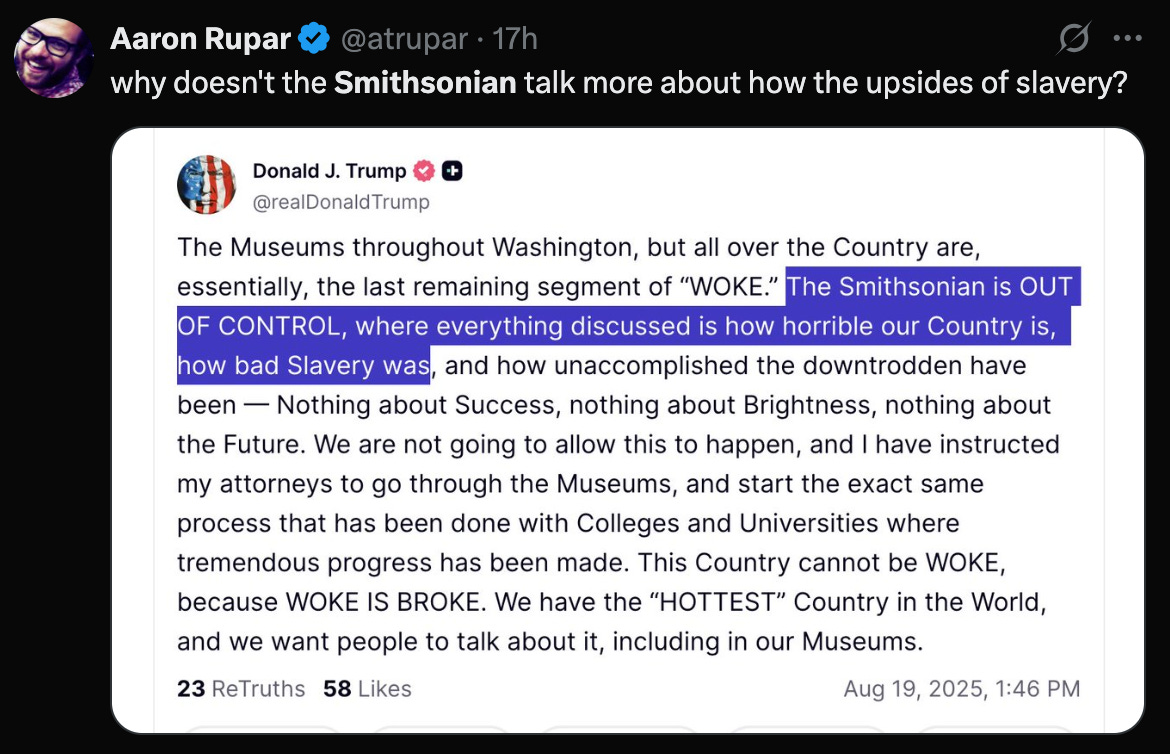 But timing matters. When a President is publicly threatening your institution while demanding “brighter” narratives, even routine curatorial changes look like capitulations. That’s how chilling effects work: they make scholars second-guess facts that should be straightforward.