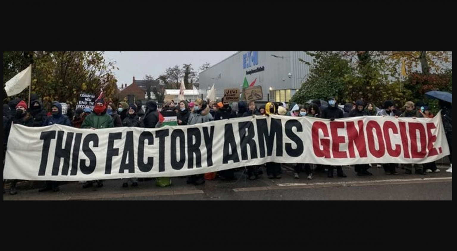 Protesters carried banners reading, “Weapons made here kill in Gaza” and, “This factory arms genocide.”