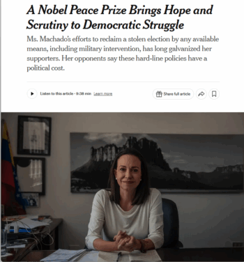 The awarding of the 2025 Nobel Peace Prize to Venezuelan far-right leader María Corina Machado took nearly everyone by surprise (with the exception of insiders who apparently used advance knowledge to profit on betting markets—New York Times, 10/10/25).