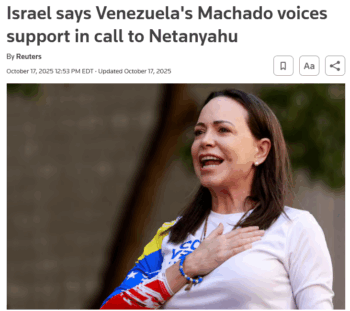 But more damning is the complete erasure of Machado’s outspoken support for Israel, even amidst the recent genocide. Venezuela’s far-right leader has repeatedly praised Israel’s defense of “Western values” and “freedom,” while her party established an alliance with Benjamin Netanyahu’s Likud in 2020. In 2018, Machado penned a letter to the Israeli prime minister, asking him to lead a foreign intervention to “dismantle the criminal Venezuelan regime.”