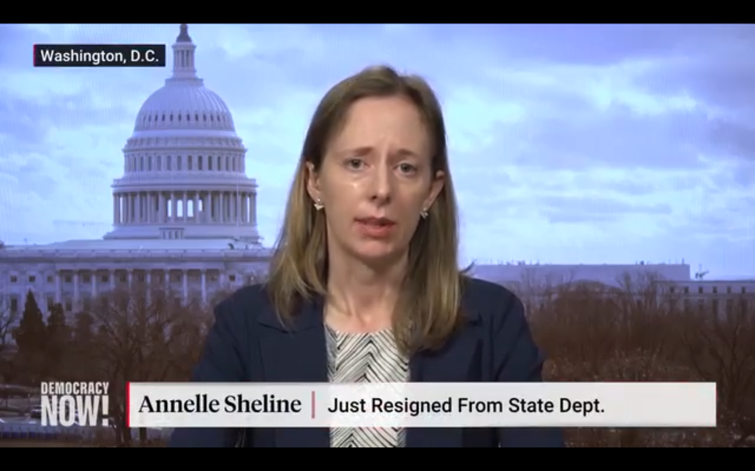 A State Department official working on human rights issues in the Middle East resigned Wednesday in protest of U.S. support for Israel’s assault on Gaza. Annelle Sheline, who worked as a foreign affairs officer in the Bureau of Democracy, Human Rights and Labor, was not planning on publicly resigning, but her colleagues asked her to “please speak out” against the Biden administration’s unconditional support for Israel. “At the end of the day, many people inside [the State Department] know that this is a horrific policy, and can’t believe that the United States government is engaged in such actions that contravene American values so directly, but the leadership is not listening,” says Sheline. “I’m trying to speak on behalf of those many, many people who feel so betrayed by our government’s stance.” Sheline describes being moved by the words of Aaron Bushnell, the active-duty U.S. airman who set himself on fire outside the Israeli Embassy in protest of the war on Gaza, who implored everyone to take a stand against genocide. “I have a young daughter, and I thought about, in the future, if she were to ask me, ‘What were you doing when this was happening? You were at the State Department.’ I want to be able to tell her that I didn’t stay silent.”